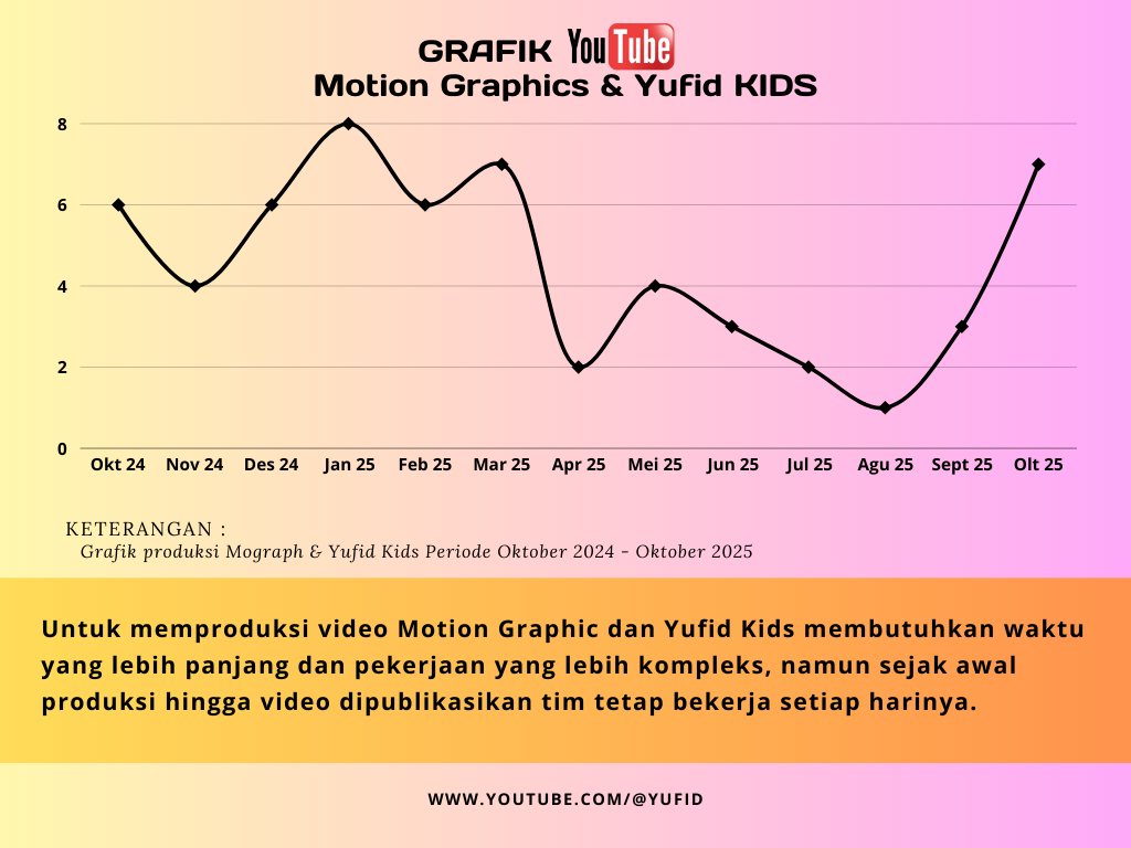 Untuk memproduksi video Motion Graphic dan Yufid Kids membutuhkan waktu yang lebih panjang dan pekerjaan yang lebih kompleks, namun sejak awal produksi hingga video dipublikasikan tim tetap bekerja setiap harinya.